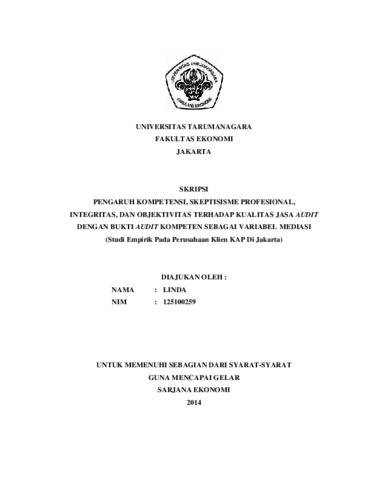 Linda, Linda (2014) PENGARFUH KOMPETENSI, SKEPTISME PROFESIONAL, INTEGRITAS, DAN OBJEKTIVITAS TERHADAP KUALITAS JASA AUDIT DENGAN BUKTI AUDIT KOMPETEN SEBAGAI VARIABEL MEDIASI (STUDI EMPIRIK PADA PERUSAHAAN KLIEN KANTOR AKUNTAN PUBLIK DI JAKARTA). Skripsi thesis, Universitas Tarumanagara.