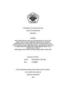 Ciptadi, Margarita (2014) PENGARUH PENGETAHUAN DAN PEMAHAMAN TENTANG PERATURAN PAJAK, PERSEPSI EFEKTIVITAS SISTEM PERPAJAKAN, KUALITAS PELAYANAN APARAT PAJAK, DAN PENYULUHAN PAJAK TERHADAP KEMAUAN MEMBAYAR PAJAK WAJIB PAJAK PADA SEKTOR USAHA MIKRO, KECIL, DAN MENENGAH (UMKM ) (Studi Empiris Pada UMKM di Wilayah Jakarta Barat Tahun 2013). Skripsi thesis, Universitas Tarumanagara.