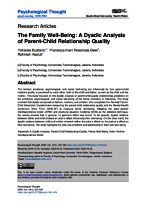 Budiarto, Yohanes and Dewi, Fransisca Iriani Roesmala and Hastuti, Rahmah (2020) The Family Well-Being: A Dyadic Analysis of Parent-Child Relationship Quality. Psychological Thought, 13 (1). pp. 221-239. ISSN 2193-7281