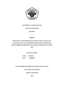 Monica, Monica (2014) PENGARUH SANKSI PERPAJAKAN, PENGETAHUAN PAJAK DAN KUALITAS PELAYANAN TERHADAP KEPATUHAN WAJIB PAJAK ORANG PRIBADI DI KPP PRATAMA JAKARTA KEMBANGAN TAHUN 2013. Skripsi thesis, Universitas Tarumanagara.