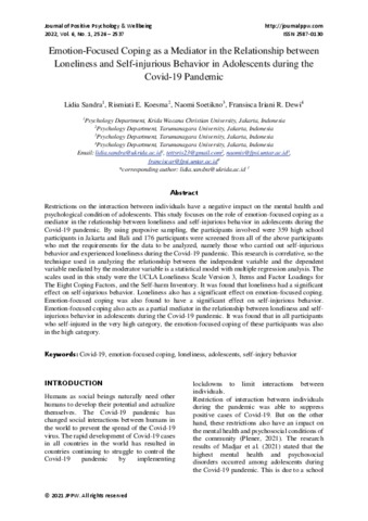 Sandra, Lidia and Koesma, Rismiyati E. and Soetikno, Naomi and Dewi, Fransisca Iriani Roesmala (2022) Emotion-Focused Coping as a Mediator in the Relationship between Loneliness and Self-injurious Behavior in Adolescents during the Covid-19 Pandemic. Journal of Positive Psychology & Wellbeing, 6 (1). pp. 2526-2537. ISSN 2587-0130