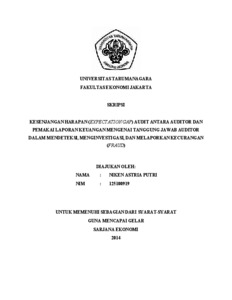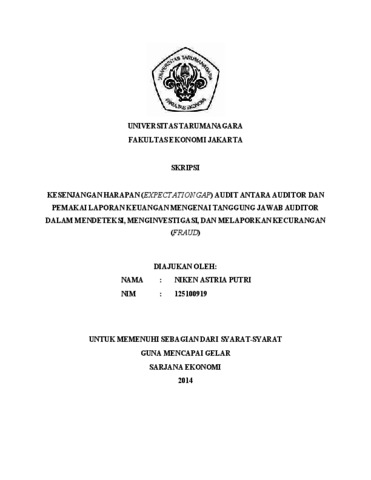 Putri, Niken Astria (2014) KESENJANGAN HARAPAN (EXPECTATION GAP ) AUDIT ANTARA AUDITOR DAN PEMAKAI LAPORAN KEUANGAN MENGENAI TANGGUNG JAWAB AUDITOR DALAM MENDETEKSI, MENGINVESTIGASI, DAN MELAPORKAN KECURANGAN (FRAUD ). Skripsi thesis, Universitas Tarumanagara.