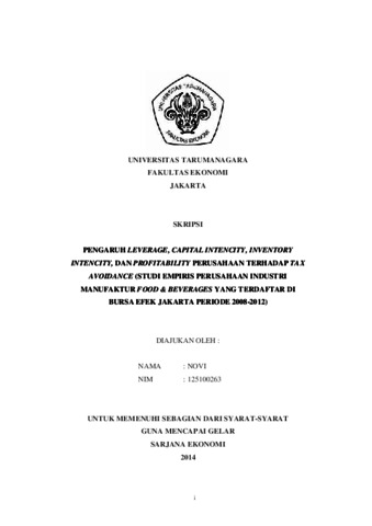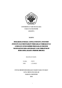 Novi, Novi (2014) PENGARUH LEVERAGE, CAPITAL INTENCITY, INVENTORY INTENCITY, DAN PROFITABILITY PERUSAHAAN TERHADAP TAX AVOIDANCE (STUDI EMPIRIS PERUSAHAAN INDUSTRI MANUFAKTUR FOOD & BEVERAGES YANG TERDAFTAR DI BURSA EFEK JAKARTA PERIODE 2008-2012). Skripsi thesis, Universitas Tarumanagara.