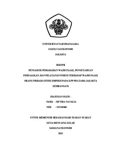 Natalia, Devira (2015) PENGARUH PEMAHAMAN WAJIB PAJAK, PENGETAHUAN PERPAJAKAN, DAN PELAYANAN FISKUS TERHADAP KEPATUHAN WAJIB PAJAK ORANG PRIBADI (STUDI EMPIRIS PADA KPP PRATAMA JAKARTA KEMBANGAN). Skripsi thesis, Universitas Tarumanagara.