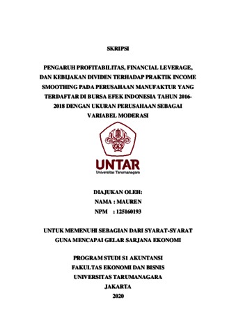 Mauren, Mauren (2020) PENGARUH PROFITABILITAS, FINANCIAL LEVERAGE, DAN KEBIJAKAN DIVIDEN TERHADAP PRAKTIK INCOME SMOOTHING PADA PERUSAHAAN MANUFAKTUR YANG TERDAFTAR DI BURSA EFEK INDONESIA TAHUN 2016- 2018 DENGAN UKURAN PERUSAHAAN SEBAGAI VARIABEL MODERASI. Skripsi thesis, Universitas Tarumanagara.
