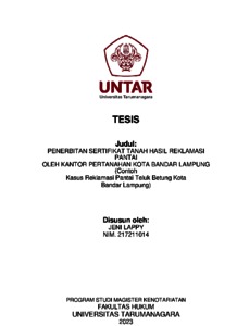 Lappy, Jenni (2023) Penerbitan Sertifikat Tanah Hasil Reklamasi Pantai Oleh Kantor Pertanahan Kota Bandar Lampung (Contoh Kasus Reklamasi Pantai Teluk Betung Kota Bandar Lampung). Masters thesis, Universitas Tarumanagara.