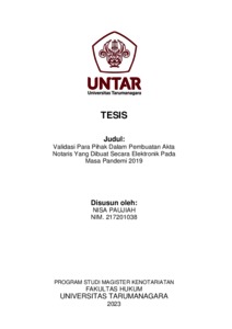Paujiah, Nisa (2023) Validasi Para Pihak Dalam Pembuatan Akta Notaris Yang Dibuat Secara Elektronik Pada Masa Pandemi 2019. Masters thesis, Universitas Tarumanagara.