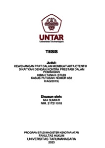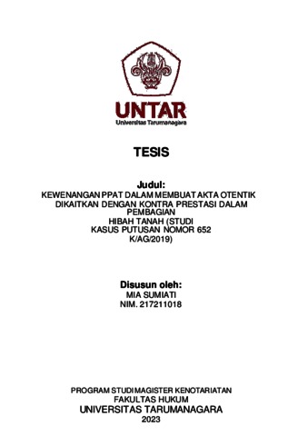Sumiati, Mia (2023) Kewenangan Ppat Dalam Membuat Akta Otentik Dikaitkan Dengan Kontra Prestasi Dalam Pembagian Hibah Tanah (Studi Kasus Putusan Nomor 652 K/Ag/2019 ). Masters thesis, Universitas Tarumanagara.