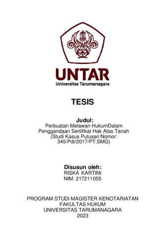 Kartini, Riska (2023) Perbuatan Melawan Hukum Dalam Penggandaan Sertifikat Hak Atas Tanah (Studi Kasus Putusan Nomor: 345/Pdt/2017/PT.SMG). Masters thesis, Universitas Tarumanagara.