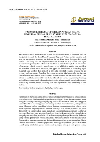 Manaf, Vita Adolfina and Firmansyah, Hery (2023) Tinjauan Kriminologi Terhadap Tindak Pidana Pencurian Ternak Di Wilayah Hukum Polda Nusa Tengara Timur. Jurnal Pro Hukum, 12 (2).