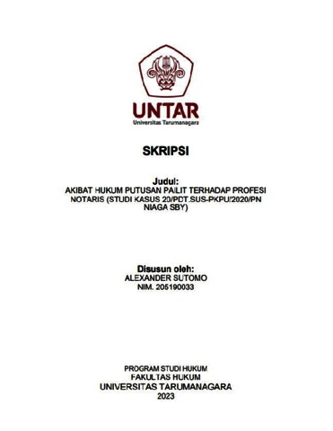 Sutomo, Alexander (2023) Akibat Hukum Putusan Pailit Terhadap Profesi Notaris (Studi Kasus 20/Pdt.Sus-Pkpu/2020/Pn Niaga Sby). Skripsi thesis, Universitas Tarumanagara.