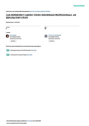 Bonar Hutapea, Penulis Pertama and Fransisca Iriani Roesmala Dewi, Penulis Kedua (2015) CAR DEPENDENCY AMONG YOUNG INDONESIAN PROFESSIONALS: AN EXPLORATORY STUDY. In: Proceeding 1st International Conference of Psychology.