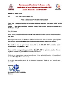 Fransisca Iriani R Dewi, Penulis Pertama and Rita Markus Idulfilastri, Penulis Kedua and Samsunuwiyati Marat, Penulis Ketiga and Siti Bahiyah, Penulis Keempat (2019) Bukti Korespondensi Resilience Modeling in Indonesian Adolescents: Associated with Quality of Life and Self-Esteem. TICASH 2019. (Unpublished)