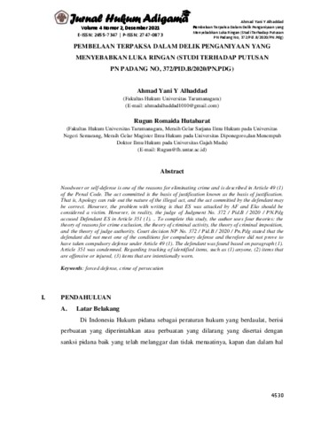 Alhaddad, Ahmad Yani Y and Hutabarat, Rugun Romaida (2021) Pembelaan Terpaksa Dalam Delik Penganiyaan Yang Menyebabkan Luka Ringan (Studi Terhadap Putusan Pn Padang No, 372PID.B2020PN.PDG). Jurnal Hukum Adigama, 4 (2). ISSN E: 2655-7343, P: 2747-0873