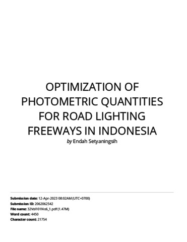 Setyaningsih, Endah and Candra, Henry (2023) Optimization Of Photometric Quantities For Road Lighting Freeways In Indonesia. Journal of Theoretical and Applied Information Technology, 101 (6). pp. 2433-2441. ISSN 1817-3195