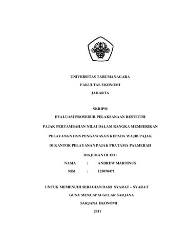Martinus, Andrew (2011) EVALUASI PROSEDUR PELAKSANAAN RESTITUSI PAJAK PERTAMBAHAN NILAI DALAM RANGKA MEMBERIKAN PELAYANAN DAN PENGAWASAN KEPADA WAJIB PAJAK DI KANTOR PELAYANAN PAJAK PRATAMA PALMERAH. Skripsi thesis, Universitas Tarumanagara.