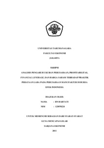 Hartati, Iin (2011) ANALISIS PENGARUH UKURAN PERUSAHAAN, PROFITABILITAS, FINANCIAL LEVERAGE, DAN HARGA SAHAM TERHADAP PRAKTIK PERATAAN LABA PADA PERUSAHAAN MANUFAKTUR DI BURSA EFEK INDONESIA. Skripsi thesis, Universitas Tarumanagara.