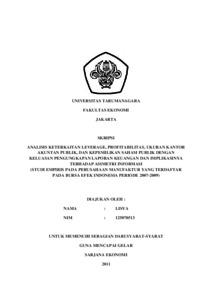 Lisya, Lisya (2011) ANALISIS KETERKAITAN LEVERAGE, PROFITABILITAS, UKURAN KANTOR AKUNTAN PUBLIK, DAN KEPEMILIKAN SAHAM PUBLIK DENGAN KELUASAN PENGUNGKAPAN LAPORAN KEUANGAN DAN IMPLIKASINYA TERHADAP ASIMETRI INFORMASI (STUDI EMPIRIS PADA PERUSAHAAN MANUFAKTUR YANG TERDAFTAR PADA BURSA EFEK INDONESIA PERIODE 2007-2009). Skripsi thesis, Universitas Tarumanagara.