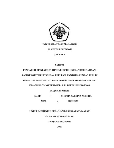 Aurora, Meutia Sabrina (2011) PENGARUH OPINI AUDIT, TIPE INDUSTRI, UKURAN PERUSAHAAN, RASIO PROFITABILITAS, DAN REPUTASI KANTOR AKUNTAN PUBLIK TERHADAP AUDIT DELAY PADA PERUSAHAAN MANUFAKTUR DAN FINANSIAL YANG TERDAFTAR DI BEI TAHUN 2005-2009. Skripsi thesis, Universitas Tarumanagara.