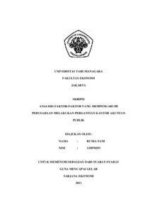 Fani, Runia (2011) ANALISIS FAKTOR-FAKTOR YANG MEMPENGARUHI PERUSAHAAN MELAKUKAN PERGANTIAN KANTOR AKUNTAN PUBLIK. Skripsi thesis, Universitas Tarumanagara.