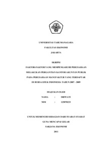 Sriwati, Sriwati (2011) FAKTOR-FAKTOR YANG MEMPENGARUHI PERUSAHAAN MELAKUKAN PERGANTIAN KANTOR AKUNTAN PUBLIK PADA PERUSAHAAN MANUFAKTUR YANG TERDAFTAR DI BURSA EFEK INDONESIA TAHUN 2007 - 2009. Skripsi thesis, Universitas Tarumanagara.