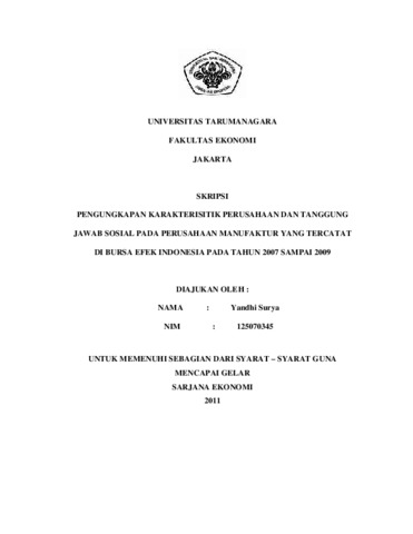Surya, Yandhi (2011) PENGUNGKAPAN KARAKTERISITIK PERUSAHAAN DAN TANGGUNG JAWAB SOSIAL PADA PERUSAHAAN MANUFAKTUR YANG TERCATAT DI BURSA EFEK INDONESIA PADA TAHUN 2007 SAMPAI 2009. Skripsi thesis, Universitas Tarumanagara.
