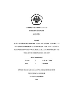 Pratiwi, Yuni (2011) PENGARUH PERSISTENSI LABA, STRUKTUR MODAL, KESEMPATAN BERTUMBUH DAN UKURAN PERUSAHAAN TERHADAP EARNINGS RESPONSE COEFFICIENT PADA PERUSAHAAN MANUFAKTUR YANG TERDAFTAR DI BEI PERIODE 2008-2009. Skripsi thesis, Universitas Tarumanagara.