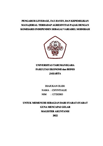Chyntialie, Chyntialie (2023) PENGARUH LEVERAGE, TAX HAVEN, DAN KEPEMILIKAN MANAJERIAL TERHADAP AGRESIVITAS PAJAK DENGAN KOMISARIS INDEPENDEN SEBAGAI VARIABEL MODERASI. Skripsi thesis, Universitas Tarumanagara.