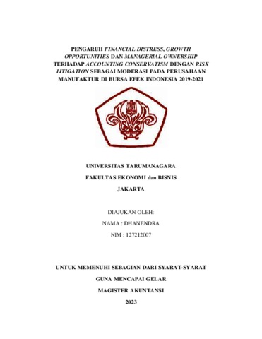 Dhanendra, Dhanendra (2023) PENGARUH FINANCIAL DISTRESS, GROWTH OPPORTUNITIES DAN MANAGERIAL OWNERSHIP TERHADAP ACCOUNTING CONSERVATISM DENGAN RISK LITIGATION SEBAGAI MODERASI PADA PERUSAHAAN MANUFAKTUR DI BURSA EFEK INDONESIA 2019-2021. Skripsi thesis, Universitas Tarumanagara.