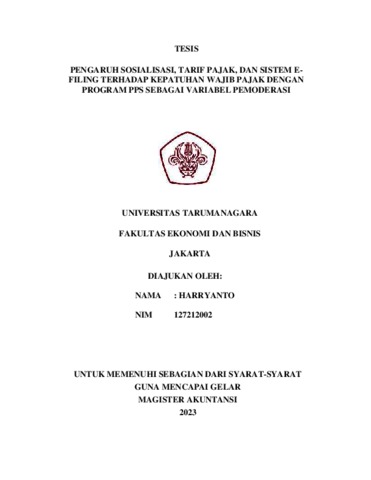 Harryanto, Harryanto (2023) PENGARUH SOSIALISASI, TARIF PAJAK, DAN SISTEM E- FILING TERHADAP KEPATUHAN WAJIB PAJAK DENGAN PROGRAM PPS SEBAGAI VARIABEL PEMODERASI. Skripsi thesis, Universitas Tarumanagara.