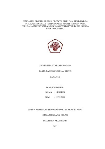 Herman, Herman (2023) Pengaruh Profitabilitas, Growth, Size, dan HPM (Harga Patokan Mineral) terhadap Net Profit Margin Perusahaan Pertambangan yang Terdaftar di BEI (Bursa Efek Indonesia). Skripsi thesis, Universitas Tarumanagara.