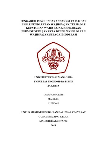 Marilyn, Marilyn (2023) PENGARUH PENGHINDARAN SANKSI PAJAK DAN BESAR PENDAPATAN WAJIB PAJAK TERHADAP KEPATUHAN WAJIB PAJAK KENDARAAN BERMOTOR DI JAKARTA DENGAN KESADARAN WAJIB PAJAK SEBAGAI MODERASI. Skripsi thesis, Universitas Tarumanagara.