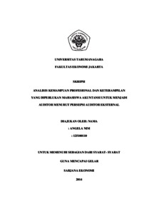 Angela, Angela (2014) ANALISIS KEMAMPUAN PROFESIONAL DAN KETERAMPILAN YANG DIPERLUKAN MAHASISWA AKUNTANSI UNTUK MENJADI AUDITOR MENURUT PERSEPSI AUDITOR EKSTERNAL. Skripsi thesis, Universitas Tarumanagara.