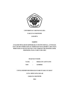 Listyanti, Meiliany (2014) ANALISIS PENGARUH KEPEMILIKAN INSTITUSIONAL, LEVERAGE, DAN UKURAN PERUSAHAAN TERHADAP MANAJEMEN LABA PADA PERUSAHAAN MANUFAKTUR YANG TERDAFTAR DI BURSA EFEK INDONESIA PADA TAHUN 2011-2012. Skripsi thesis, Universitas Tarumanagara.