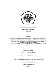 Agustina, Ria (2014) PENGARUH SKEPTISISME PROFESIONAL, EFEKTIFITAS INTERNAL AUDIT, PERSEPSI AUDITOR, DAN ETIKA DEONTOLOGI TERHADAP KUALITAS JASA AUDIT KEUANGAN DENGAN DESAIN PEKERJAAN SEBAGAI VARIABEL MODERASI (Studi Empirik Pada Perusahaan Klien Kantor Akuntan Publik Big Four di Jakarta). Skripsi thesis, Universitas Tarumanagara.