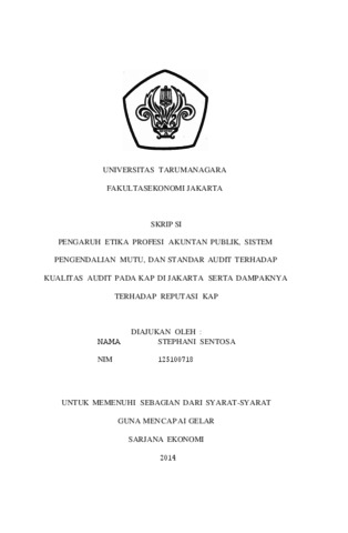 Sentosa, Stephani (2014) PENGARUH ETIKA PROFESI AKUNTAN PUBLIK, SISTEM PENGENDALIAN MUTU, DAN STANDAR AUDIT TERHADAP KUALITAS AUDIT PADA KAP DI JAKARTA SERTA DAMPAKNYA TERHADAP REPUTASI KAP. Skripsi thesis, Universitas Tarumanagara.