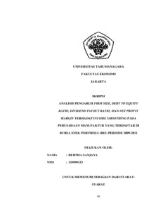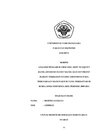 Sanjaya, Bertha (2014) ANALISIS PENGARUH FIRM SIZE, DEBT TO EQUITY RATIO, DIVIDEND PAYOUT RATIO, DAN NET PROFIT MARGIN TERHADAP INCOME SMOOTHING PADA PERUSAHAAN MANUFAKTUR YANG TERDAFTAR DI BURSA EFEK INDONESIA (BEI) PERIODE 2009-2011. Skripsi thesis, Universitas Tarumanagara.