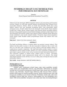 Industri kecil dan menengah (IKM) merupakan industri yang menyokong perekonomian nasional. Industri ini telah pula menjadi tumpuan perekonomian bagi sebagian besar masyarakat Indonesia. Namun, dilain sisi masih ada kelemahan dalam daya saing industri industri kecil dan menengah merupakan faktor yang melemahkan dalam persaingan pasar. Produk industri kecil dan menengah selalu identik dengan kualitas produk yang rendah. Desain sebagai bagian yang berperan dalam menunjang kualitas dan daya saing produk tampaknya masih belum mendapat perhatian pelaku industri kecil dan menengah. Ketersediaan sumber daya manusia bidang keilmuan desain khususnya desain komunikasi visual masih menjadi kendala. Perguruan tinggi desain tampaknya masih enggan untuk berpihak dalam pengembangan desain bagi industri kecil dan menengah.