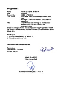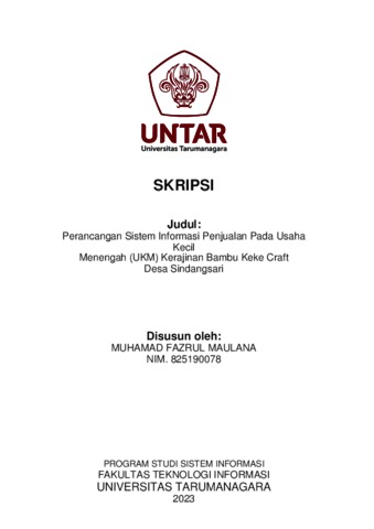 Maulana, Muhamad Fazrul (2023) Perancangan sistem informasi penjualan pada usaha kecil menengah (UKM) kerajinan bambu Keke Craft desa Sindangsari. Skripsi thesis, Universitas Tarumanagara.