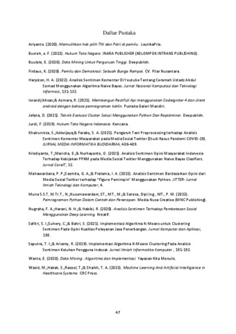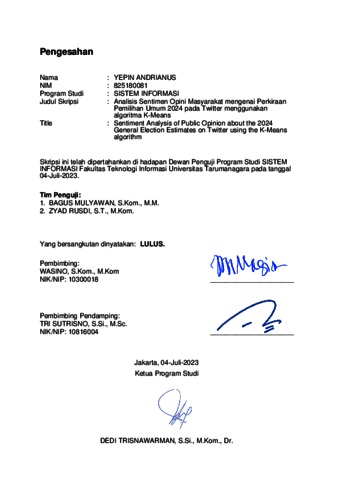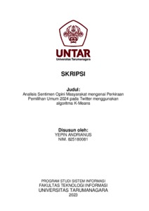 Andrianus, Yepin (2023) Analisis sentimen opini masyarakat mengenai perkiraan pemilihan umum 2024 pada Twitter menggunakan algoritma k-means. Skripsi thesis, Universitas Tarumanagara.