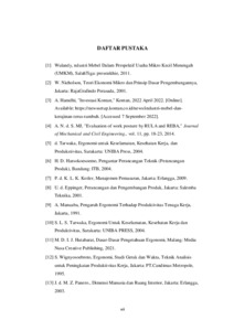 Modesty Sofa merupakan salah satu UMKM yang bergerak di bidang industri meubel yang memproduksi berbagai jenis sofa. Dalam proses produksi pembuatan sofa terbagi menjadi dua stasiun, yaitu stasiun pembuatan kerangka sofa dan stasiun finishing sofa. Kurangnya fasilitas yang memadai seperti alat pemotongan bahan kain yang masih dilakukan secara manual di lantai menyebabkan postur kerja kurang ergonomis. Berdasarkan hasil penyebaran kuesioner NBM kepada 2 pegawai, ditemukan bahwa para pegawai merasakan sakit pada area leher, punggung, pinggang, bahu, paha, betis, dan kaki. Pada analisis REBA didapatkan skor 5 (level medium risk) pada postur kerja berjongkok dan didapatkan skor 8 (level high risk) pada postur kerja berlutut, dan pada analisis OWAS didapatkan skor 2 untuk postur kerja berjongkok dan berlutut. Dari kondisi yang telah dijelaskan, maka perlu dilakukan perancangan rak penyimpanan dan pemotongan kain roll yang dapat memperbaiki postur kerja pegawai dan mempermudah pegawai dalam mencari bahan kain. Hasil penilaian REBA pada postur kerja berdiri pegawai setelah melakukan implementasi alat bantu kerja rak penyimpanan dan pemotongan kain roll yang baru mendapatkan skor 3 (low risk), dan pada penialaian OWAS, mendapatkan nilai 1, yang berarti postur kerja berada pada posisi aman. Kata Kunci: Sofa, NBM, REBA, OWAS