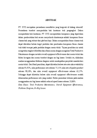 PT. XYZ merupakan perusahaan manufaktur yang bergerak di bidang otomotif. Perusahaan tersebut memproduksi bak kontainer truk pengangkut. Dalam memproduksi bak kontainer, PT. XYZ memproduksi komponen yang diperlukan dalam pembentukan bak secara menyeluruh diantaranya adalah komponen frame chassis bak yang terbuat dari plat besi baja. Dalam memproduksi frame chassis truk dapat diketahui bahwa target produksi dari pembuatan komponen frame chassis truk tidak tercapai pada produksi dengan mesin tekuk. Tujuan penelitian ini untuk mengetahui tingkat efektifitas dan efisien mesin dengan mengalisa Total Productive Maintenance dengan metode overall equipment effectiveness dari mesin tekuk dan faktor kerugian dari mesin tersebut dengan six big losses. Setelah itu, dilakukan analisa menggunakan fishbone diagram untuk mendapatkan penyebab masalah dari mesin tekuk. Dari Hasil penelitian, dapat diketahui bahwa rata-rata nilai avalaibility sebesar 91,92%, nilai performance rate sebesar 75,11% nilai rate of quality product sebesar 90,18%, dan nilai overall equipment effectiveness sebesar 62,27%. Sehingga dapat diketahui bahwa nilai overall equipment effectiveness rendah dikarenakan performance rate yang rendah. Faktor presentase terbesar pada analisa menggunakan six big losses adalah reduced speed losses sebesar 23,86%. Kata Kunci: Total Productive Maintenance, Overall Equipment Effectiveness, Fishbone Diagram, Six Big Losses