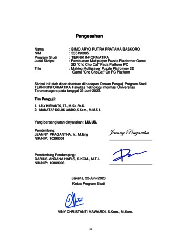 Baskoro, Bimo Aryo Putra Pratama (2023) Pembuatan multiplayer puzzle platformer game 2d "cho cho cat" pada platform pc. Skripsi thesis, Universitas Tarumanagara.