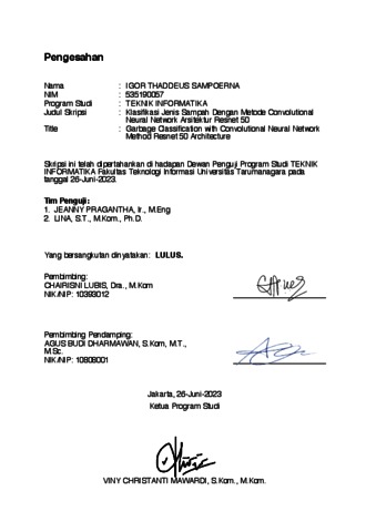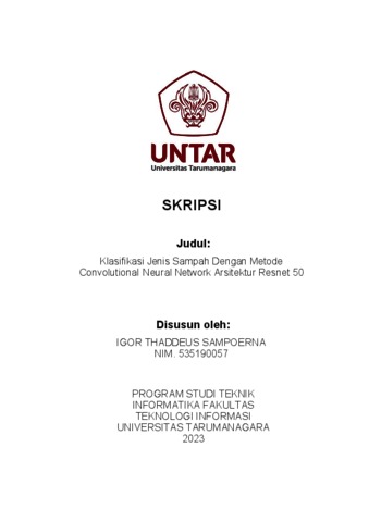 Sampoerna, Igor Thaddeus (2023) Klasifikasi jenis sampah dengan metode convolutional neural network arsitektur resnet 50. Skripsi thesis, Universitas Tarumanagara.