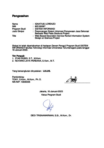 Lorenzo, Ignatius (2023) Perancangan sistem informasi penyewaan jasa dekorasi berbasis web pada gianluca project. Skripsi thesis, Universitas Tarumanagara.