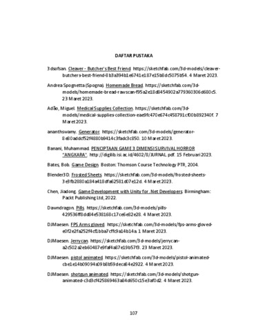 Game "Surviving the Night Invasion" adalah game 3D dengan genre Horror Survival yang dikembangkan untuk platform Windows. Game ini dirancang sebagai game single player yang dapat dimainkan menggunakan keyboard dan mouse. Pemain akan menghadapi lingkungan gelap di malam hari dan melihat dari sudut pandang karakter utama (first person). Tujuan utama dalam game ini adalah mencari vaksin sebelum tingkat infeksi mencapai 100% dan menyalakan generator untuk memanggil bantuan dan keluar dari pulau tersebut. Pengujian dilakukan melalui metode blackbox testing, alpha testing oleh dosen pembimbing, dan beta testing dengan menggunakan kuesioner yang diisi oleh 30 responden. Mayoritas responden menganggap tampilan 3D dalam game ini realistis, dengan kualitas grafis dan audio yang baik. Atmosfer dan situasi dalam game mampu menciptakan perasaan tegang pada pemainnya. Hasil pengujian menunjukkan bahwa game ini berhasil memberikan pengalaman bermain yang realistis dan interaktif melalui penggunaan teknologi grafis 3D. Secara keseluruhan, "Surviving the Night Invasion" menawarkan pengalaman survival horror yang menarik dan menegangkan. Cocok untuk pemain yang mencari tantangan dan bertahan hidup dalam situasi penuh ancaman zombie. Kata Kunci: Surviving the Night Invasion, Horror Survival, Unity, first person, Zombie.