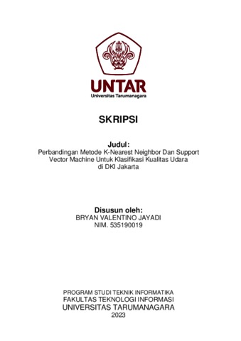 Jayadi, Bryan Valentino (2023) Perbandingan metode k-nearest neighbor dan support vector machine untuk klasifikasi kualitas udara di DKI Jakarta. Skripsi thesis, Universitas Tarumanagara.