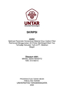 Hendito, Mikael Sean (2023) Optimasi parameter konsentrasi material onyx-carbon fiber reinforced menggunakan 3d-printer markforged mark two terhadap kekuatan tarik di pt. Matahari megah (TM - 1330). Skripsi thesis, Universitas Tarumanagara.