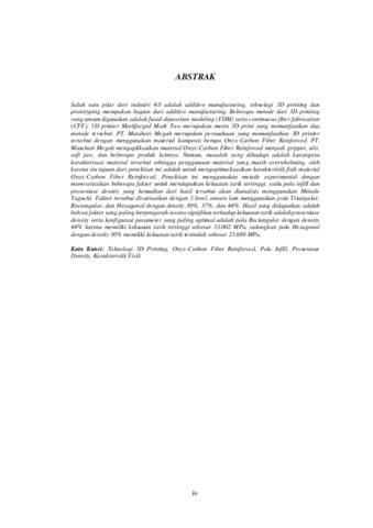 Salah satu pilar dari industri 4.0 adalah additive manufacturing, teknologi 3D printing dan prototyping merupakan bagian dari additive manufacturing. Beberapa metode dari 3D printing yang umum digunakan adalah fused deposition modeling (FDM) serta continuous fiber fabrication (CFF). 3D printer Markforged Mark Two merupakan mesin 3D print yang memanfaatkan dua metode tersebut. PT. Matahari Megah merupakan perusahaan yang memanfaatkan 3D printer tersebut dengan menggunakan material komposit berupa Onyx-Carbon Fiber Reinforced. PT. Matahari Megah mengaplikasikan material Onyx-Carbon Fiber Reinforced menjadi gripper, ulir, soft jaw, dan beberapa produk lainnya. Namun, masalah yang dihadapi adalah kurangnya karakterisasi material tersebut sehingga penggunaan material yang masih overwhelming, oleh karena itu tujuan dari penelitian ini adalah untuk mengoptimalisasikan karakteristik fisik material Onyx-Carbon Fiber Reinforced. Penelitian ini menggunakan metode experimental dengan memvariasikan beberapa faktor untuk mendapatkan kekuatan tarik tertinggi, yaitu pola infill dan prosentase density yang kemudian dari hasil tersebut akan dianalisis menggunakan Metode Taguchi. Faktor tersebut divariasikan dengan 3 level, antara lain menggunakan pola Triangular, Rectangular, dan Hexagonal dengan density 30%, 37%, dan 44%. Hasil yang didapatkan adalah bahwa faktor yang paling berpengaruh secara signifikan terhadap kekuatan tarik adalah prosentase density serta konfigurasi parameter yang paling optimal adalah pola Rectangular dengan density 44% karena memiliki kekuatan tarik tertinggi sebesar 33.002 MPa, sedangkan pola Hexagonal dengan density 30% memiliki kekuatan tarik terendah sebesar 25.689 MPa. Kata Kunci: Teknologi 3D Printing, Onyx-Carbon Fiber Reinforced, Pola Infill, Prosentase Density, Karakteristik Fisik