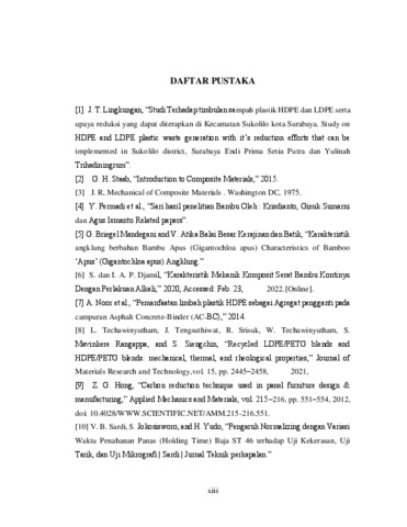 Jumlah sampah plastik semakin lama semakin bertambah, pada tahun 2010, jumlah sampah di Indonesia mencapai 3,22 juta ton per tahun. Jumlah tersebut akan terus meningkat pada tahun-tahun mendatang, yang mengalami peningkatan sekitar 10% per-tahun. Menurut ahli menyatakan bahwa jumlah komposisi limbah HDPE di Brazil menempati posisi kedua setelah PET dengan jumlah sekitar 30% dari total plastik yang terkumpul. Indonesia menduduki posisi kedua setelah Tiongkok dengan jumlah sampah plastik sebanyak 187,2 juta ton. Penelitian ini bertujuan untuk mengetahui pengaruh temperatur terhadap kekuatan Tarik bahan polimer dapat memiliki kekuatan yang digunakan untuk HDPE berserat bamboo. Penelitian ini menggunakan metode penelitian dan pengambilan data akan membahas mulai dari pembuatan daur ulang plastik HDPE dengan serat bamboo, selanjutnya akan dilakukan uji Tarik dan Uji Bending untuk melihat kekuatan dari hasil daur ulang tersebut. Proses daur ulang HDPE diawali dengan mengumpulkan tutup botol plastik bekas yang berbahan HDPE yang akan dihancurkan sebelum dimasukkan kedalam Mesin Hot Press. Selanjutnya Hasil penghancuran tersebut dimasukkan kedalam Mesin Hot Press untuk di daur ulang menjadi Panel Board Furniture. Berdasarkan hasil data pengujian yang diperoleh menunjukkan bahwa (1) Variasi penambahan partikel serat bambu pada spesimen HDPE mempengaruhi sifat fisik yang menyebabkan spesimen memiliki nilai modulus elastisitas lebih besar dibandingkan dengan spesimen tanpa penambahan partikel serat bambu pada HDPE. Hal ini menyebabkan nilai tegangan pada spesimen menjadi lebih besar, dan nilai regangan menjadi lebih kecil. (2) Pullout terdapat pada semua jenis Spesimen yang di uji Tarik yang dapat diartikan sebagai ikatan antar Reinforced terhadap matriks kurang baik atau ikatan antar serat bambu dan Plastik HDPE tidak menyatu. (3) Pada hasil uji tarik terlihat bahwa semakin besar temperatur yang dipanaskan, maka akan semakin lemah kekuatan tariknya. dengan demikian, semakin rendah temperaturnya, maka akan semakin kuat nilai dari kekuatan tariknya. Hal ini dapat dilihat dari data hasil pengujian uji tarik spesimen HDPE. Kata kunci: High Density Polyethylene Berserat Bambu, Temperature Melting Komposit Polimer